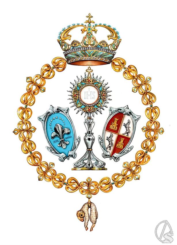 En el óvalo izquierdo, que flanquea la Custodia del Santísimo Sacramento, aparece, tal y como se contemplase en el pasado, la flor de lis; con doce estrellas en su superficie, y bajo la cual aparece la inscripción Ave María. Esto viene a revertir su sustitución por la cruz de Santiago, que aparecía sobre un fondo morado, y cuyo significado no guardaba ningún tipo de relación con la historia ni ningún atributo de la hermandad.
