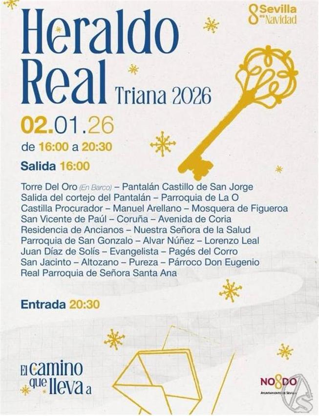 Arte Sacro. En la tarde de hoy el Heraldo de Triana recorrerá las calles del barrio partiendo a las 16:00 horas de la Torre Del Oro en barco hasta el pantalán Castillo de San Jorge, desde donde saldrá el cortejo hacia la Parroquia de La O, Castilla Procurador, Manuel Arellano, Mosquera de Figueroa, San Vicente de Paul, Coruña, Avenida de Coria, Residencia de Ancianos, Nuestra Señora de la Salud, Parroquia de San Gonzalo, Alvar Núñez, Lorenzo Leal, Juan Diaz de Solís, Evangelista, Pagés del Corro, San Jacinto, Altozano, Pureza, Párroco Don Eugenio, Real Parroquia de Señora Santa Ana entrando a las 20:30 horas.