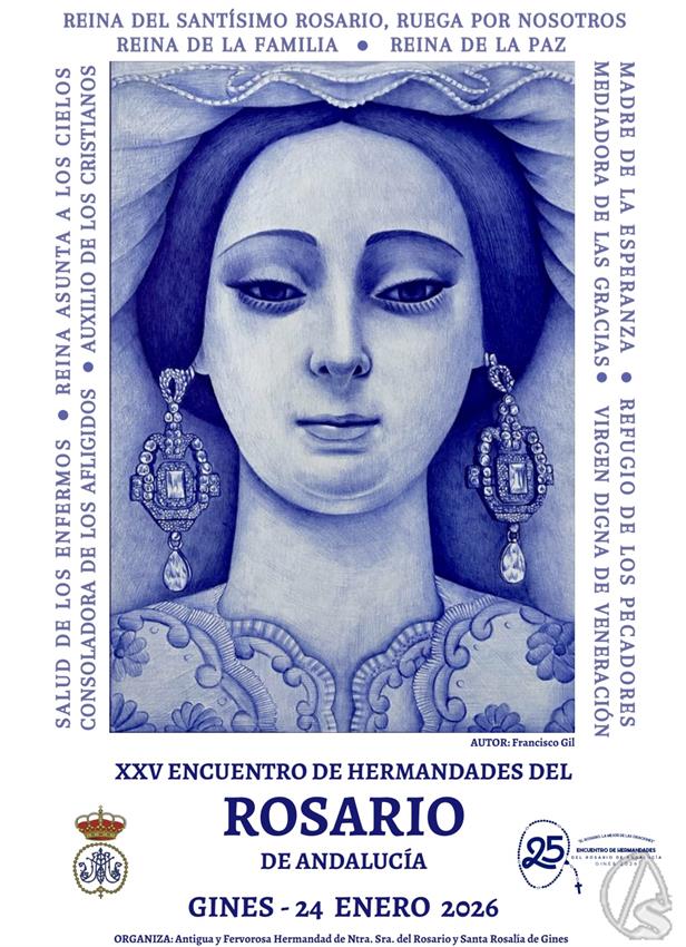 Arte Sacro. El próximo sábado 24 de enero se celebrará en Gines el XXV Encuentro de Hermandades del Rosario de Andalucía. Esta cita anual congrega a numerosas hermandades, cofradías, agrupaciones, asociaciones y grupos de fieles que profesan el amor y la devoción a María Santísima en su advocación del 'Rosario' o del 'Santo Rosario de Fátima', organizada por la Antigua y Fervorosa Hermandad de Nuestra Señora del Rosario y Santa Rosalía, de Gines.