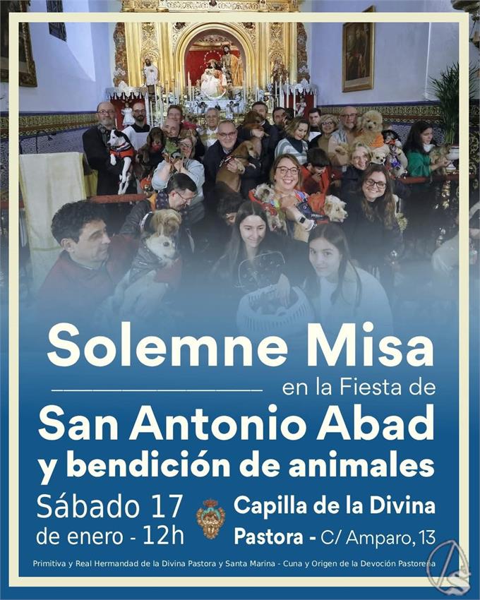 Arte Sacro. El próximo sábado, día 17 de enero, festividad litúrgica de San Antonio Abad, a partir de las 12 horas, se celebrará la santa misa en la capilla. Al término del Santo Sacrificio, saludaran a la Divina Pastora con el canto propio de este Tiempo Litúrgico y posteriormente se procederá a la bendición de los animales que hayan acudido a esta celebración.