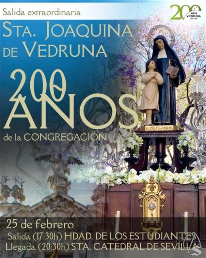 Arte Sacro. El miércoles 25 de febrero, víspera del 200 aniversario de la fundación de las Carmelitas Vedruna, el colegio sevillano realizará una procesión extraordinaria en honor a Santa Joaquina, partiendo desde la Universidad, acogida por la Hermandad de los Estudiantes, a las 17:30 horas, llegando hasta la Catedral a las 20:30 horas.