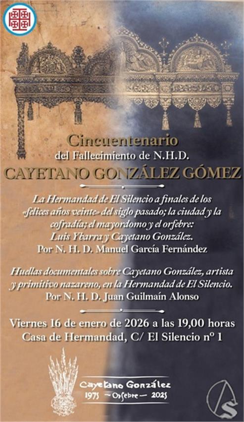 Arte Sacro. En el marco del cincuentenario del fallecimiento de Cayetano González Gómez, la Hermandad del Silencio celebra hoy viernes 16 de enero a las 19:00 horas, en la casa hermandad, un acto conmemorativo dedicado a profundizar en su figura y legado, referente esencial de la orfebrería y del patrimonio cofrade sevillano.