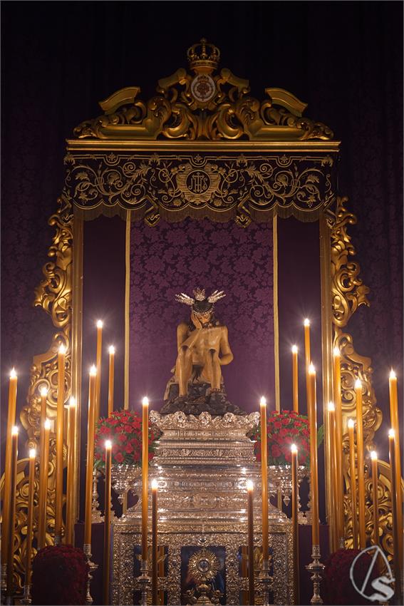 Para este triduo, la corporación del Domingo de Ramos ha dispuesto un altar que dialoga con la imagen sin restarle protagonismo. El montaje se articula como un gran dosel de inspiración barroca, ricamente dorado, que enmarca la escena y eleva visualmente al Señor. En la parte superior, presidiendo el conjunto, aparece el emblema cristológico del JHS, flanqueado por una profusa decoración de roleos y hojarasca, rematada por una corona que subraya la realeza espiritual de Cristo incluso en el momento de la humillación.