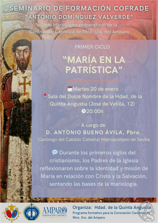 Arte Sacro. El martes día 20 de enero, nueva sesión del Seminario de Formación Cofrade Antonio Domínguez Valverde, de las hermandades de la parroquia de Santa María Magdalena. Dentro del ciclo dedicado a Mariología con motivo de la coronación canónica de Nuestra Señora del Amparo, Antonio Bueno Ávila, pbro., Canónigo de la Santa Iglesia Catedral, tratará el tema "María en la Patrística".