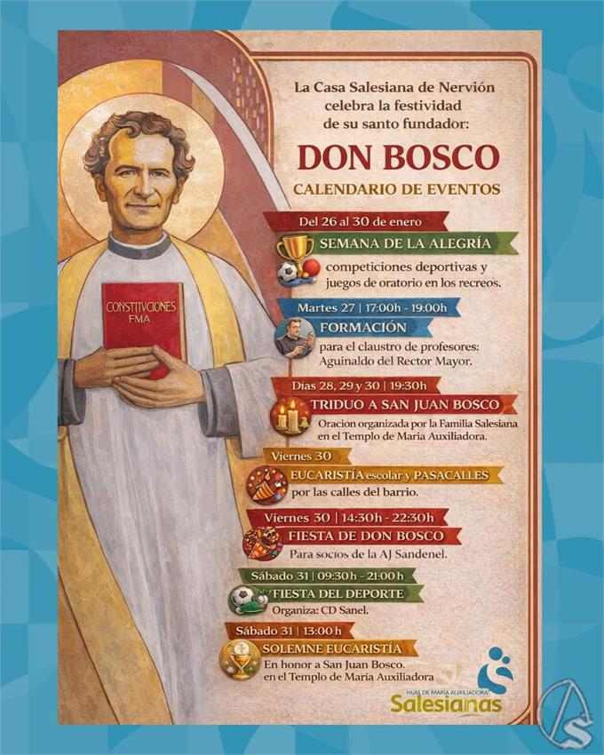 Arte Sacro. La Escuela Salesiana Maria Auxiliadora de Nervión, sita en la calle Espinosa y Cárcel, celebra triduo en honor a San Juan Bosco, en la capilla del Colegio, los días 28, 29 y 30 de enero, a las 19,30 horas, con la celebración de la Palabra y oraciones del triduo a San Juan Bosco. Participan los grupos de la Familia Salesiana.