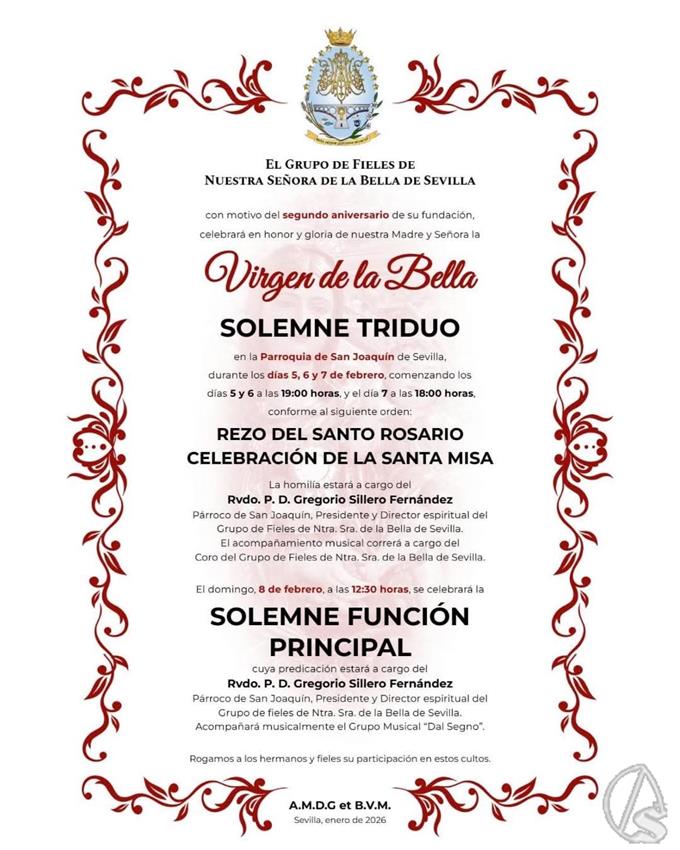 Arte Sacro. Con motivo del segundo aniversario de su fundación, el Grupo de Fieles de Nuestra Señora de la Bella de Sevilla celebrará, en honor y gloria de la Madre y Señora, la Virgen de la Bella, solemne triduo en la parroquia de San Joaquín, durante los días 5, 6 y 7 de febrero.