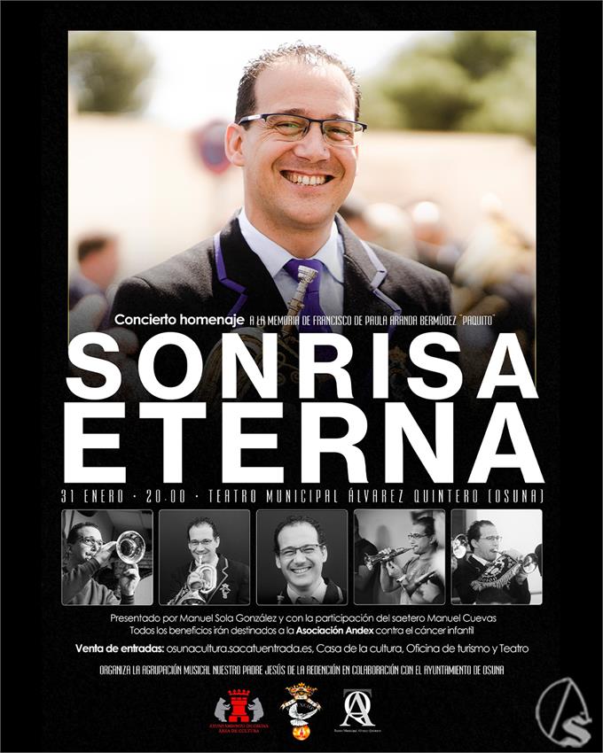 Arte Sacro. El Teatro Municipal Álvarez Quintero de Osuna acogerá el 31 de enero de 2026 a las 20,00 horas el espectáculo «Sonrisa Eterna», un concierto homenaje a la memoria de Francisco de Paula Aranda Bermúdez «Paquito», organizado por la Agrupación Musical Nuestro Padre Jesús de la Redención con la colaboración del Ayuntamiento de Osuna.