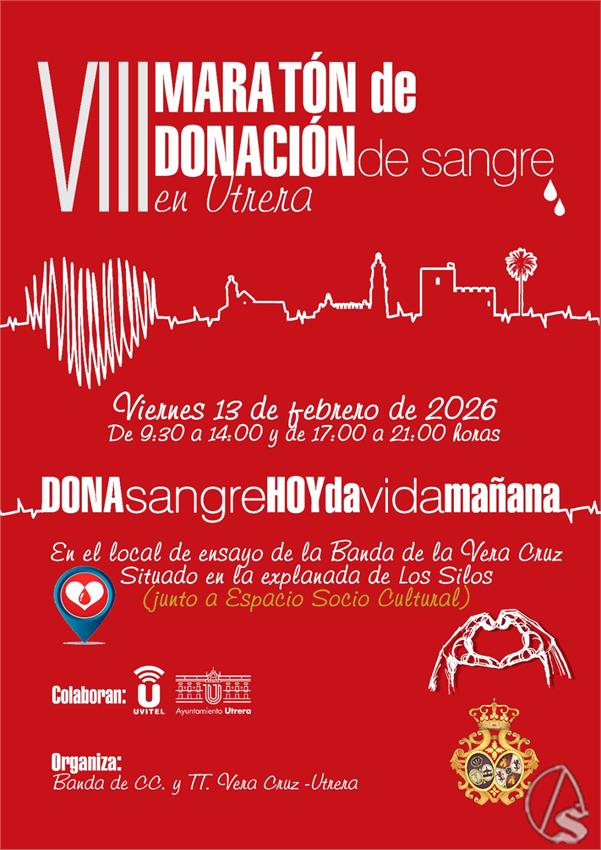 Arte Sacro. Utrera se prepara para un nuevo gesto silencioso de entrega, de esos que no llenan titulares pero sostienen vidas. El próximo viernes 13 de febrero de 2026, Utrera acogerá la VIII Maratón de Donación de Sangre, una cita ya consolidada que vuelve a unir compromiso social y espíritu fraterno bajo un mismo pulso.