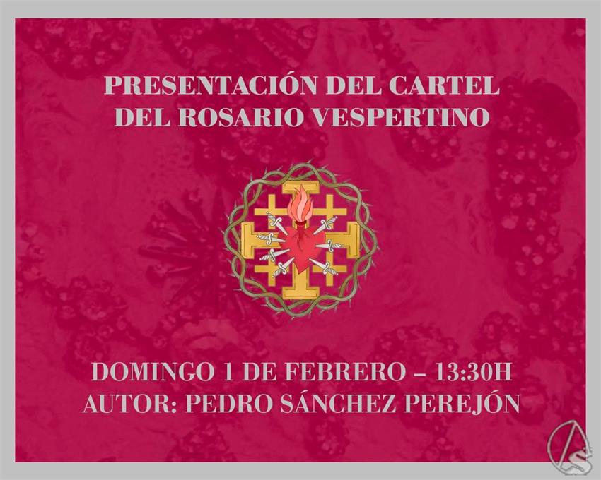Arte Sacro. El próximo domingo 1 de febrero, tras la celebración de la misa dominical de las 12,30 horas, tendrá lugar la presentación del cartel anunciador del rosario vespertino del Grupo de Fieles del Mayor Dolor de La Barzola, realizado por Pedro Sánchez Perejón.