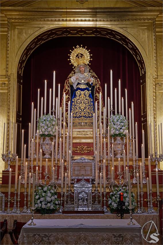 A los pies del altar, la plata labrada aporta un brillo sobrio y elegante, recordando la tradición universitaria y cofrade que custodia esta devoción. Los exornos florales, en tonos claros, aportan frescura y equilibrio, subrayando la pureza y la delicadeza del mensaje mariano sin restar protagonismo a la imagen titular.