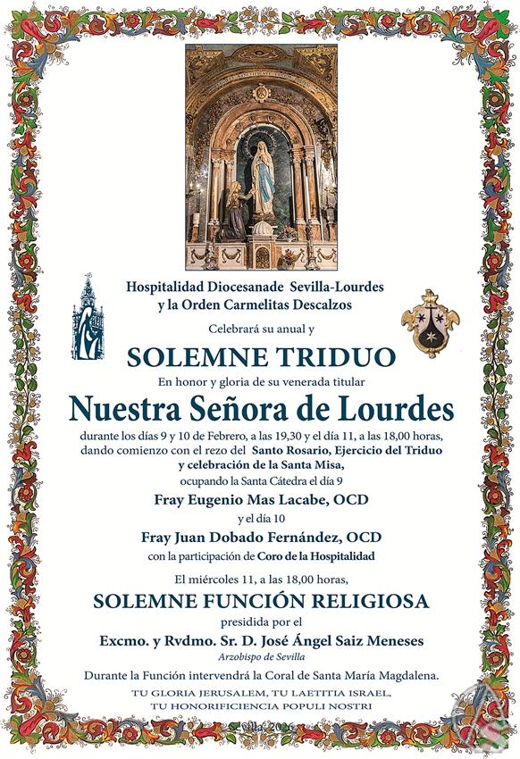 Arte Sacro. Febrero vuelve a abrirse paso en el calendario sevillano con un acento mariano inconfundible. La Hospitalidad Diocesana de Sevilla-Lourdes, junto a la Orden de los Carmelitas Descalzos, convoca un año más a los fieles a reunirse en torno a Nuestra Señora de Lourdes, Madre cercana y consuelo de los enfermos, para celebrar su anual y solemne triduo.