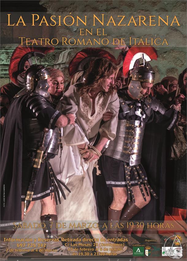 Arte Sacro. Con la colaboración institucional de la Delegación de Turismo, Cultura y Deporte de la Junta de Andalucía, la Dirección del Conjunto Arqueológico de Itálica y el Ayuntamiento de la localidad de Santiponce, un año más, el teatro romano de Itálica será el escenario de la Pasión, Muerte y Resurrección del Señor en tiempos de Cuaresma. De la mano de la diputación de Formación y Juventud de la Hermandad de Ntro. Padre Jesús Nazareno de Santiponce y organizada por la Asociación “Juventud Nazarena” la cita, el próximo día 7 de marzo, a las siete y media de la tarde.