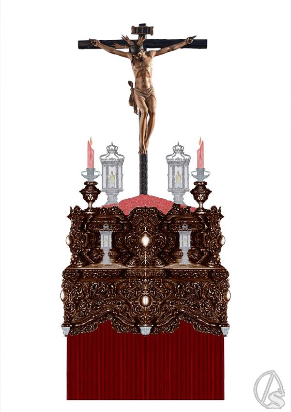En la canastilla irán esculpidas ocho representaciones del misterio de la Vera Cruz, siendo estas la muerte de Adán, la reina de Saba adorando el puente de Siloé, la construcción de la Cruz, el sueño de Constantino, el hallazgo de la Santa cruz por Santa Elena, la autenticidad de la Cruz, el emperador Heracles devolviendo la Cruz a Jerusalén y la Exaltación de la Santa Cruz. Estas esculturas serán ejecutadas en madera estofada de oro.
