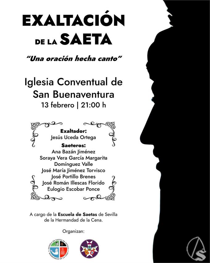 Arte Sacro. El próximo viernes, 13 de febrero, tras la misa de hermandad de la Soledad de San Buenaventura, sobre las 21 horas, se celebrará el acto de la Exaltación de la saeta, presentado por la Escuela de Saetas de Sevilla, con sede en la hermandad de la Sagrada Cena.