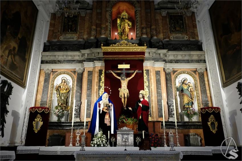Si bien la Hermandad presentó ayer a los Titulares y a San Juan en el altar mayor, el Santísimo Cristo de las Almas será el que presida habitualmente este lugar, mientras que María Santísima de Gracia y Amparo recibirá culto en el lateral del evangelio, acompañada por San Juan Evangelista. La Virgen, vestida de hebrea, porta manto de terciopelo azul, rematado con raso blanco; saya primitiva de terciopelo burdeos y tocado confeccionado con paño egipcio de tul de algodón marfil, bordado en plata. En el fajín porta alfiler con su nombre, mientras que en su mano izquierda luce rosario de filigranas de plata.