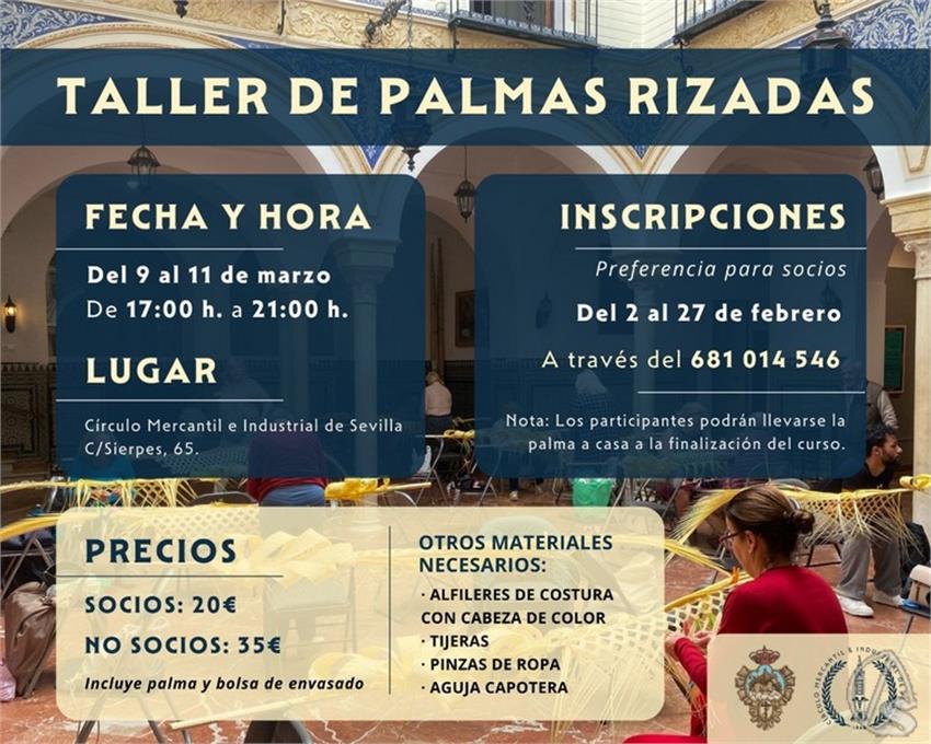 Arte Sacro. Tras el éxito obtenido en años anteriores, durante esta Cuaresma se impartirá de nuevo el taller de palmas rizadas en el patio de la sede del Círculo Mercantil, en C/Sierpes, 65. Los participantes podrán llevarse la palma a casa a la finalización de este.
