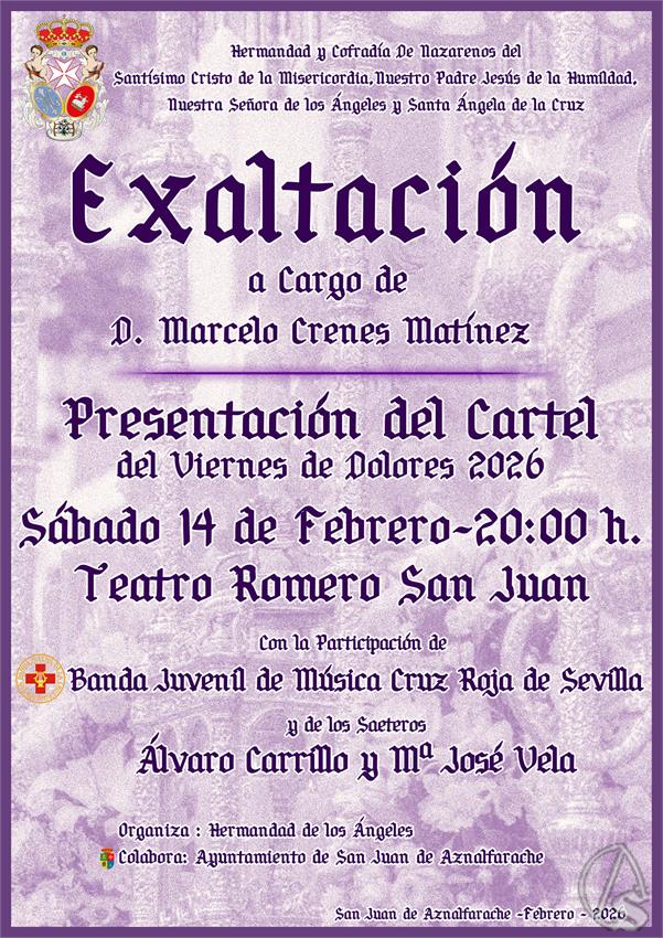 Arte Sacro. La Hermandad y Cofradía de Nazarenos del Santísimo Cristo de la Misericordia, Nuestro Padre Jesús de la Humildad, Nuestra Señora de los Ángeles y Santa Ángela de la Cruz de San Juan de Aznalfarache, celebrará el acto de Exaltación y Presentación del Cartel del Viernes de Dolores 2026 el próximo 14 de febrero, a las 20:00 horas, en el Teatro Romero San Juan.
