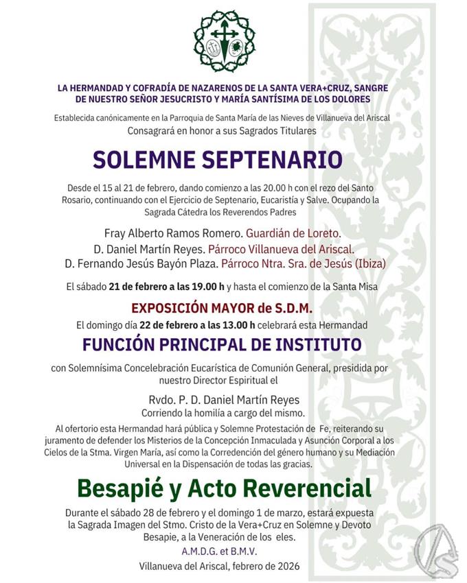 Arte Sacro. Villanueva del Ariscal se prepara para vivir una de las semanas más intensas y cargadas de unción de su calendario litúrgico. La Hermandad y Cofradía de Nazarenos de la Santa Vera+Cruz, Sangre de Nuestro Señor Jesucristo y María Santísima de los Dolores, establecida canónicamente en la Parroquia de Santa María de las Nieves, ha anunciado la celebración de los cultos en honor a sus Sagrados Titulares para este mes de febrero de 2026.