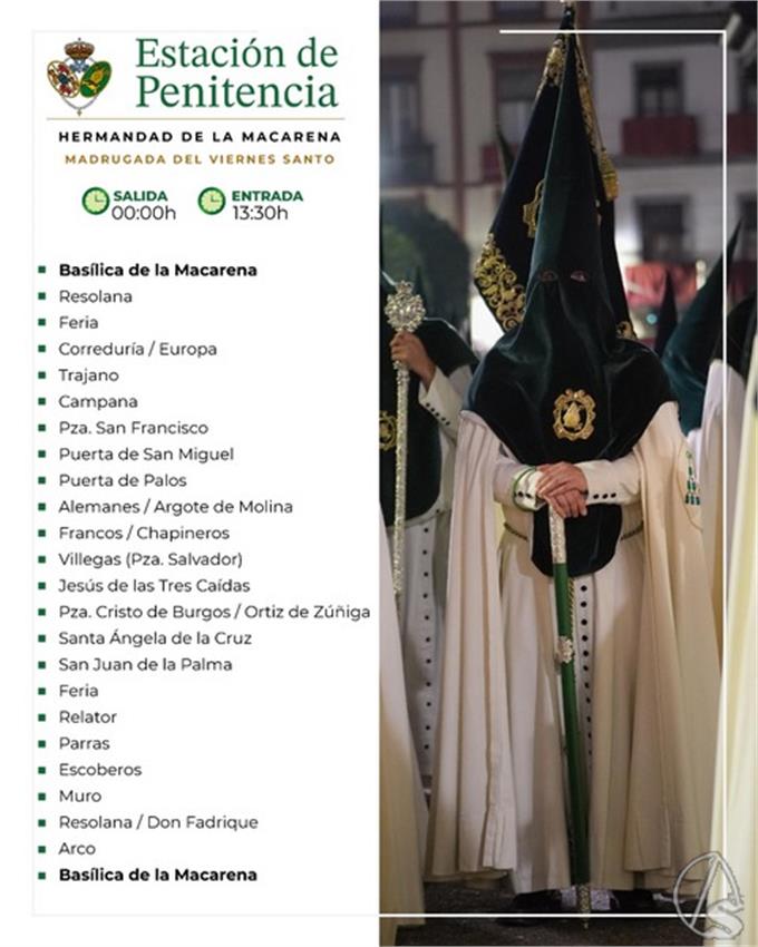 En cuanto al horario, la salida de la Cruz de Guía será a las 00:00 horas, mientras que el regreso del paso de palio de María Santísima de la Esperanza Macarena está previsto a las 13:30 horas en el cancel de la Basílica.