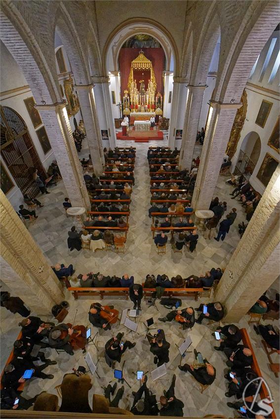 Desde los pies del presbiterio, una orquesta de cuerda y viento, junto con el coro, elevaba sus notas hacia el Señor, retomando la antigua tradición musical de la hermandad en los cultos al Cristo de las Tres Caídas. Los violines, las violas, los violonchelos y los metales se convirtieron en plegaria sonora, sosteniendo cada momento de la liturgia y envolviendo las palabras del celebrante en un clima de oración que hacía casi innecesario hablar.