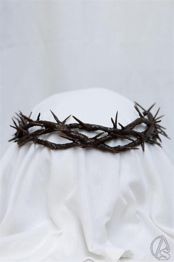 La posterior policromía, resuelta en tonos tierra muy oscuros y veladuras verdosas y encarnadas, acabada en mate, contribuye a reforzar el carácter austero y penitencial de la corona, evitando brillos y protagonismos superfluos.