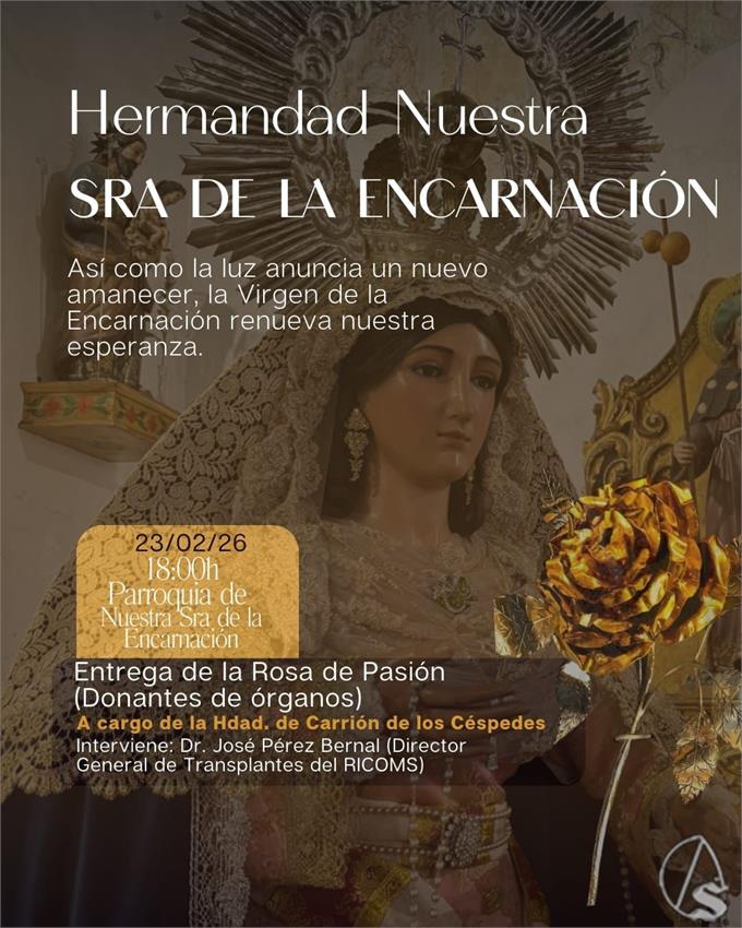 Arte Sacro. El próximo 23 de febrero, a las 18:00 horas, la Parroquia de Nuestra Señora de la Encarnación se convertirá en un pequeño cenáculo de esperanza compartida. La Hermandad de Nuestra Señora de la Encarnación recibirá la Rosa de Pasión por los donantes de órganos, un símbolo que une para siempre la devoción mariana con el mayor gesto de caridad posible: dar vida después de la vida.??