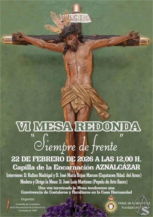 La Hermandad de la Vera Cruz de Aznalcázar celebra el domingo 22 de febrero de 2026, a las 12:00 horas, la VI Mesa Redonda bajo el título Siempre de frente, una cita ya consolidada en el calendario cofrade de la localidad y de la provincia de Sevilla.
