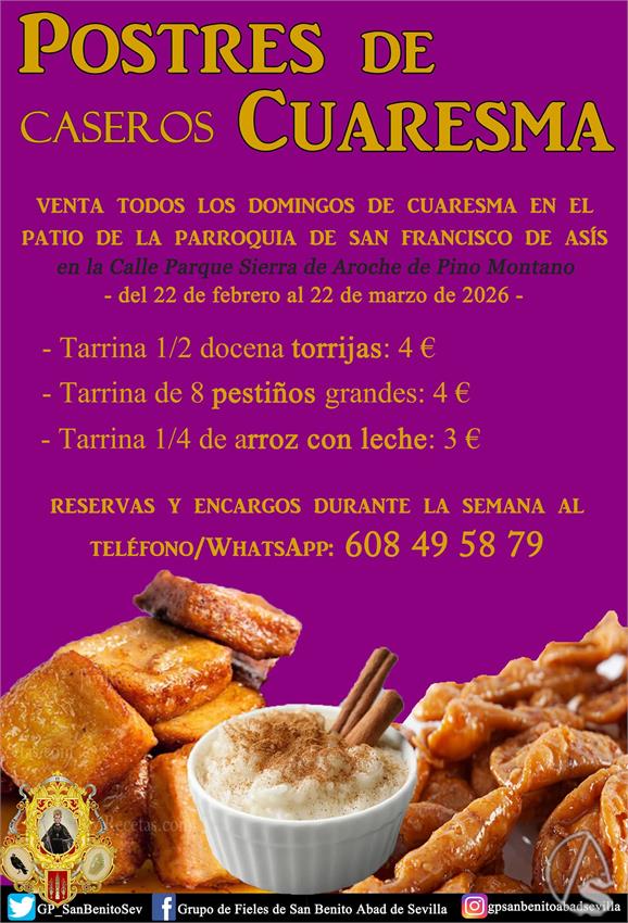 Arte Sacro. Todos los domingos de Cuaresma habrá venta de postres caseros de Cuaresma en el patio de la parroquia de San Francisco de Asís (c/ Parque Sierra de Aroche de Pino Montano).