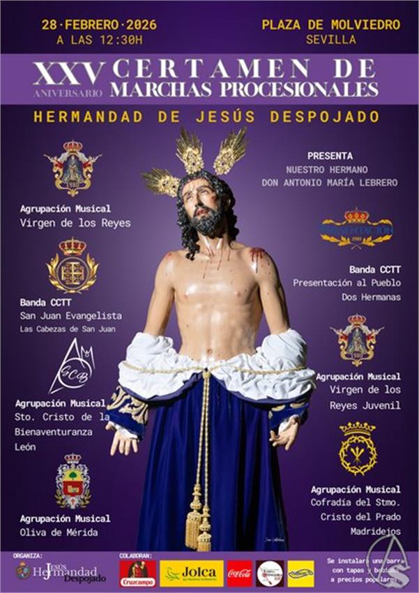 Arte Sacro. Sevilla volverá a latir al compás de las cornetas y tambores con la celebración del XXV Certamen de Marchas Procesionales organizado por la Hermandad de Jesús Despojado, que tendrá lugar el próximo 28 de febrero de 2026, a las 12:30 horas, en la Plaza de Molviedro.