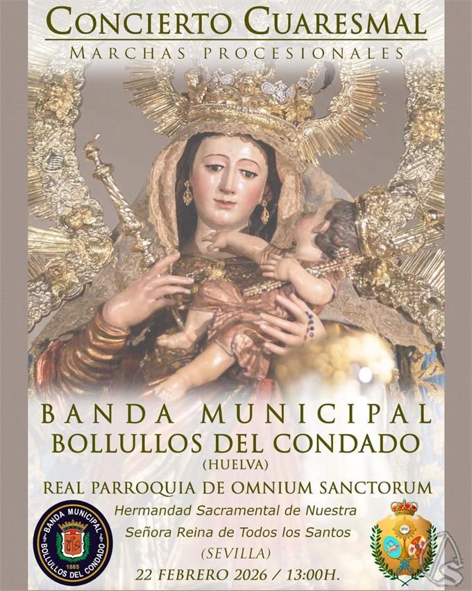 Arte Sacro. El próximo domingo, 22 de febrero, a las 13 horas, la hermandad de la Reina de Todos los Santos organiza el concierto cuaresmal de marchas procesionales de la Banda municipal de Bollullos del Condado, en la parroquia de Omnium Sanctorum.