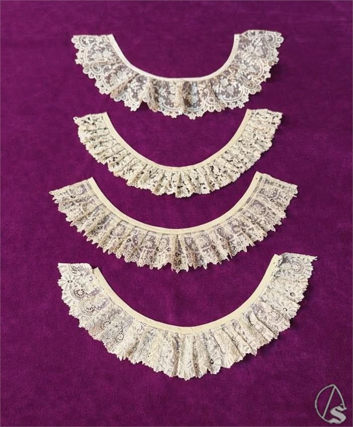 Dos de estas piezas han sido realizadas mediante la técnica del Punto de Aguja, fechadas entre los siglos XVII y XVIII, destacando por la finura de su ejecución y su antigüedad. Las otras dos corresponden a técnicas posteriores: una elaborada en Aplicación de Bruselas, datada en el siglo XIX, y otra confeccionada en Rosaline, característico encaje de bolillos belga de finales del mismo siglo.
