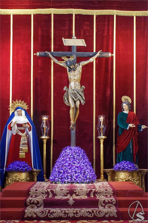 Fco Javier Montiel. Ante el altar encendido y el terciopelo rojo que enmarca la escena, el Santísimo Cristo del Amor se ofrece a la mirada y al beso humilde de sus fieles. La imagen, elevada en la serenidad solemne del templo, concentra en su anatomía herida toda la verdad del Amor que no se reserva nada. A sus pies, la plegaria callada se hace flor morada y promesa íntima, mientras la Virgen y el discípulo amado acompañan el misterio con la elocuencia del silencio.
