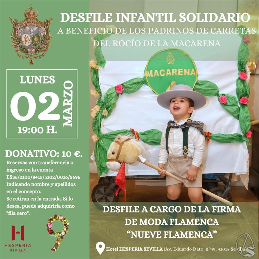 Arte Sacro. La hermandad del Rocío de la Macarena celebrará el próximo lunes 2 de marzo, a las 19 horas, un desfile infantil solidario a beneficio de los padrinos de carretas del Rocío de la Macarena. El acto se desarrollará en el Hotel Hesperia Sevilla, situado en la avenida Eduardo Dato, nº 49.
