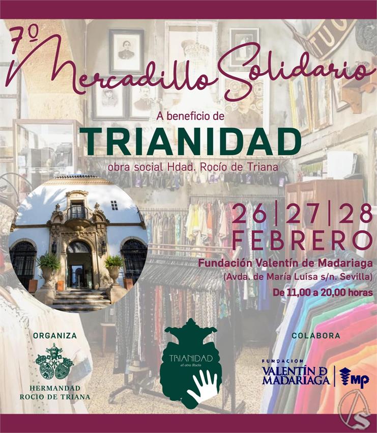 Arte Sacro. La hermandad del Rocío de Triana, a través de su Diputación de Caridad, organiza la séptima edición de su Mercadillo Solidario, cuyos beneficios se destinarán íntegramente a su labor asistencial. El evento se celebrará, si Dios quiere, los días 26, 27 y 28 de febrero en la Fundación Valentín de Madariaga (Avenida de María Luisa s/n, Sevilla), en horario ininterrumpido de 11 a 20 horas.