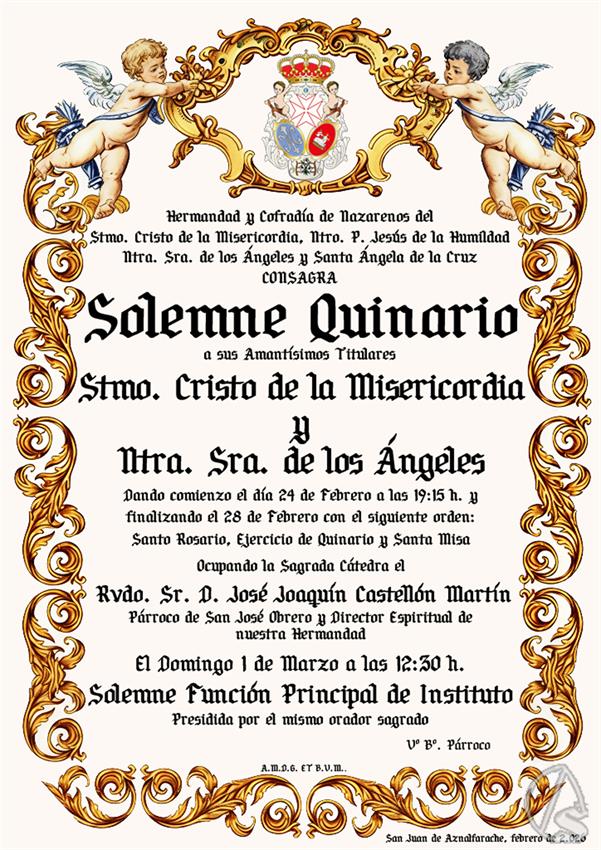 Este tendrá lugar los días 24, 25, 26, 27 y 28 de febrero, a las 19:15 horas, con el siguiente orden, eezo del Santo Rosario, ejercicio de Quinario y Santa Misa.