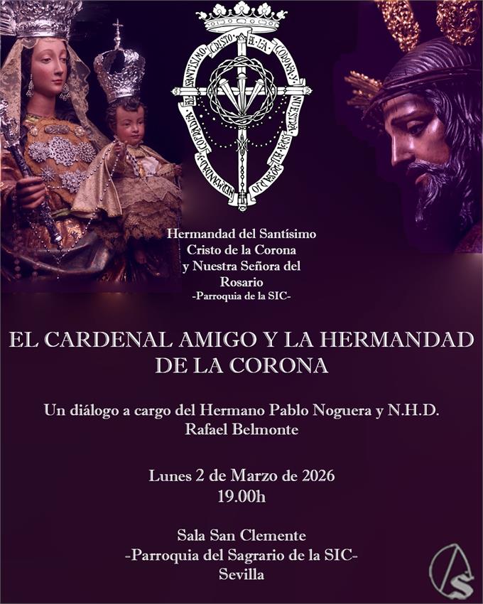 Arte Sacro. La hermandad del Santísimo Cristo de la Corona y Nuestra Señora del Rosario, con sede en la parroquia del Sagrario de la Santa Iglesia Catedral de Sevilla, celebrará el próximo lunes 2 de marzo, a las 19 horas, el acto titulado 'El Cardenal Amigo y la Hermandad de la Corona'.