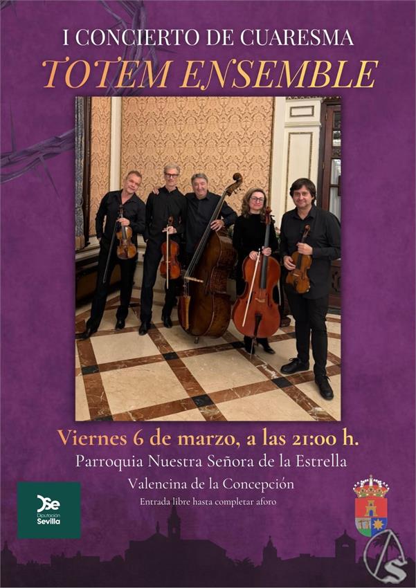 Arte Sacro. El quinteto internacional de cuerda Tótem Ensemble, reconocido por su trayectoria en la interpretación de música de cámara, pondrá música al I Concierto de Cuaresma en la localidad de Valencina de la Concepción, una propuesta que busca integrar la experiencia sonora de alto nivel en los espacios singulares del municipio.