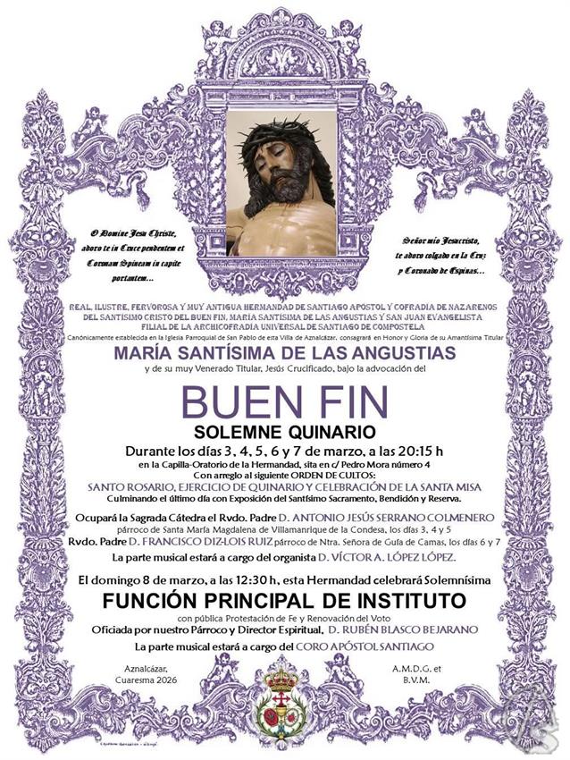 Arte Sacro. La próxima semana, segunda de cuaresma, dará comienzo en la Hermandad el Santísimo Cristo del Buen Fin y la Santísima Virgen de las Angustias, de la localidad de Aznalcázar, el solemne Quinario que anualmente dedica a sus Titulares.