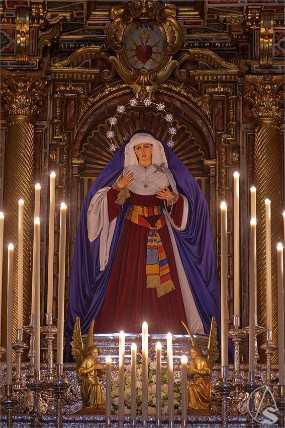El presbiterio de la Iglesia conventual de Santa Isabel se presenta presidido por un imponente retablo barroco, marco excepcional para de los cultos de la hermandad debido al cierre de San Julián. Ante él, la Santísima Virgen se alza sobre una cuidada peana, vestida de hebrea con saya burdeos y manto azul, tocada con encajes y orfebrería que subrayan la sobriedad y el equilibrio del conjunto.
