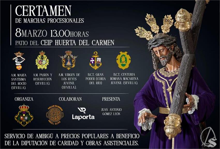 Arte Sacro. El domingo 8 de marzo a partir de las 13:00 horas, el patio del CEIP Huerta del Carmen (acceso por calles Cereza y Purgatorio), se llenará de sentimiento y sones cofrades con la celebración del certamen de marchas procesionales, en el que intervendrán las siguientes formaciones: