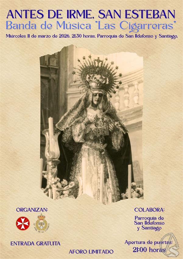 Arte Sacro. El miércoles 11 de marzo, la hermandad de San Esteban vivirá una nueva cita imprescindible de la Cuaresma con el concierto de la Banda de música María Stma. de la Victoria "Las Cigarreras".