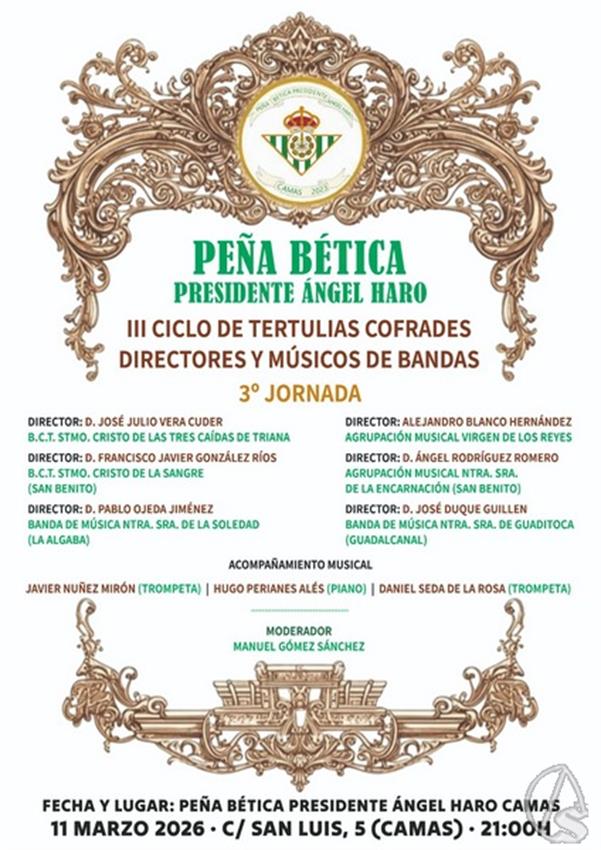 Arte Sacro. La Peña Bética presidente Ángel Haro que se encuentra en C/ San Luis, 5 de Camas celebra el III Ciclo de tertulias cofrades el 11 marzo a las 21:00 horas, participando en la tercera jornada: