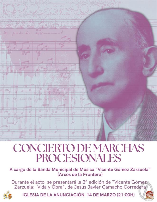 Arte Sacro. El próximo sábado, 14 de marzo, a las 21 horas tendrá lugar en la sede de la hermandad del Valle un concierto de marchas procesionales a cargo de la Banda municipal de Arcos de la Frontera Vicente Gómez Zarzuela, que interpretará, entre otras, marchas del ilustre hermano y otras dedicadas a la Archicofradía.