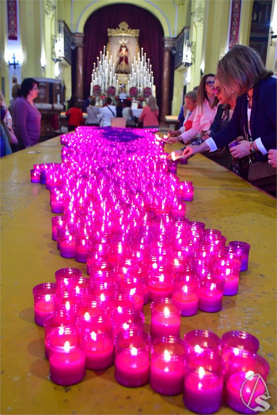 A los pies del altar, centenares de velas encendidas dibujan una estela luminosa que avanza sobre la mesa de ofrendas. Son velas encendidas por fieles que llegan en silencio, algunos con paso decidido, otros con la pausa propia de quien trae consigo una súplica o una gratitud. Cada llama es una historia, una petición, un recuerdo.