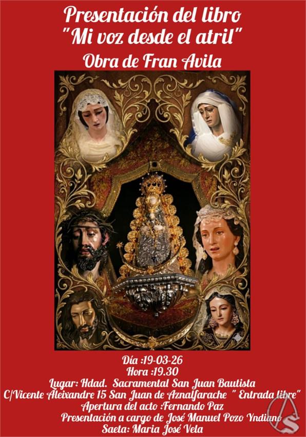 Arte Sacro. El próximo jueves día 19 de marzo, se presentará en la localidad de San Juan de Aznalfarache, el nuevo libro cofrade de Fran Ávila bajo el nombre " Mi voz desde el Atril".