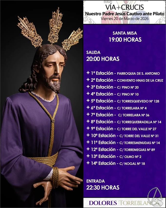 Arte Sacro. El Vía Crucis con el Señor Cautivo de Torreblanca recorrerá este viernes, 20 de marzo, cuarto de Cuaresma, las calles de la feligresía al finalizar la santa misa que comenzará a partir de las 19 horas, finalizando sobre las 22,30 horas.