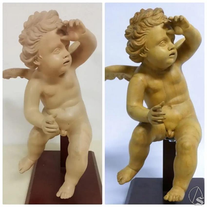 El equipo llevó a cabo una restitución volumétrica en las zonas donde el soporte había desaparecido, seguida del estucado de las lagunas y un asentado de color mediante barniz base. La reintegración cromática devolvió el equilibrio estético a los ángeles, culminando con la protección final y el ajuste de brillos para garantizar una lectura homogénea bajo la iluminación procesional.