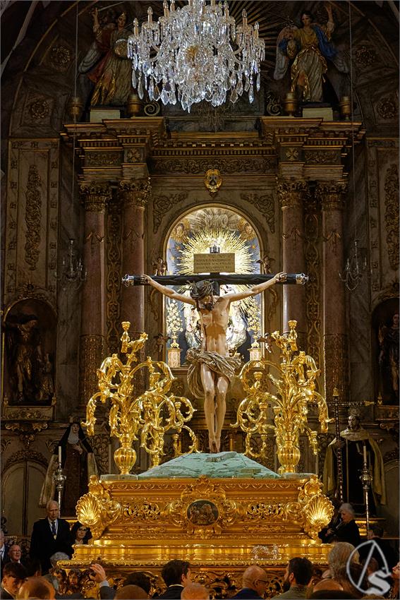 Mientras tanto, el paso aguardaba ya dispuesto en la nave central, convertido en destino y símbolo. Allí, ante la mirada atenta de fieles y devotos, se produjo el instante culminante. El Cristo de los Desamparados fue izado lentamente, en una maniobra cuidada y precisa, hasta quedar enclavado en su paso procesional.