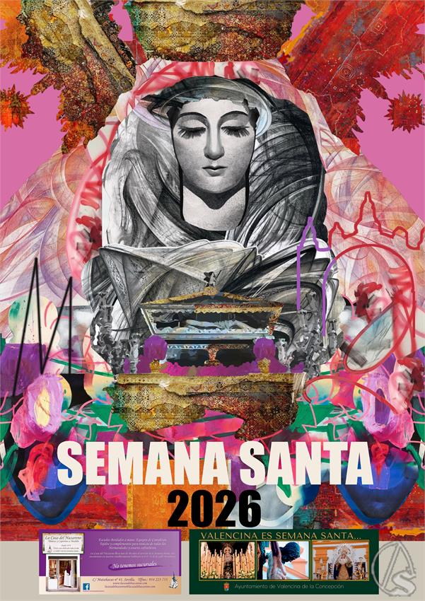 Este cartel, gracias al patrocinio de La Casa del Nazareno y el Ayuntamiento de Valencina de la Concepción, será, un año más, editado en papel, y servirá de portada de la edición 2026 del programa de mano El Muñidor del Aljarafe.
