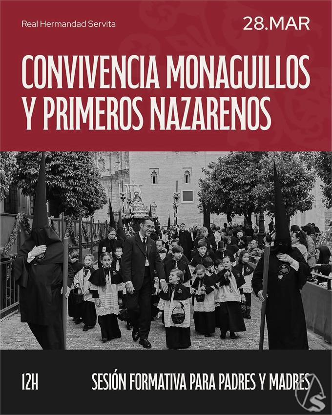 Arte Sacro. El próximo día sábado 28 de marzo, a las 12 horas, la hermandad de los Servitas celebrará la tradicional convivencia dirigida a los más jóvenes de la corporación, monaguillos/as y nazarenos/as menores de 14 años que hagan por primera vez estación de penitencia.